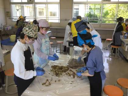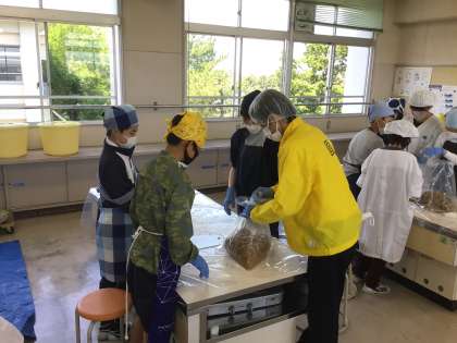 今日は、地域の桝塚味噌の方に来ていただき、6年生がみそ作り体験を行いました。