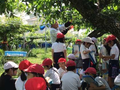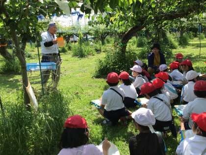 3年生は定期的に梨畑見学し、梨が成長する様子や、世話の内容などを学んでいます。