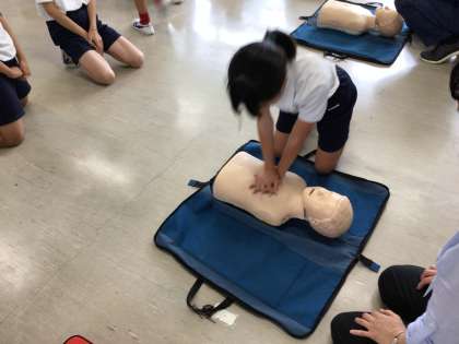 そして、一人一人人形を使って心臓マッサージの練習をしました。