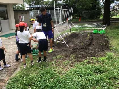 4年生が畑にゴーヤを植えたり、支柱を設置したりしていました。