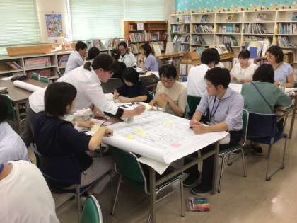 授業後の研究協議会の様子です。 豊田市教育センター教科指導員の先生からご指導いただきました。