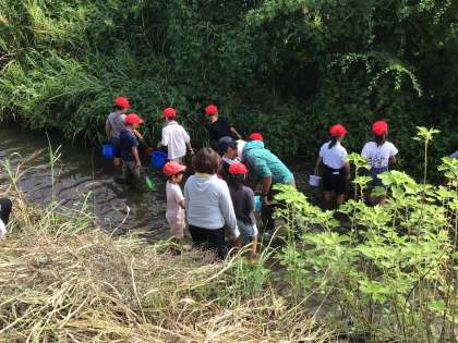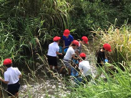 天候にも恵まれ、本日、2年生が阿部夏丸先生と一緒に家下川で川の生き物を捕まえました。