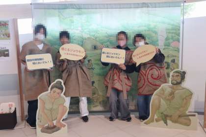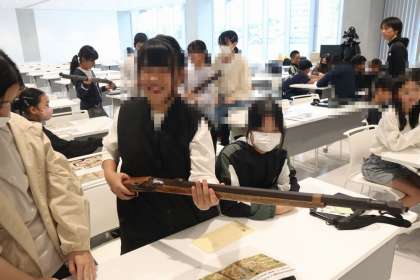 見学に行った6年生は縄文時代の服を着たり、火縄銃を持ったりするなど、実際に「感じる」体験を通して学びを深めました。