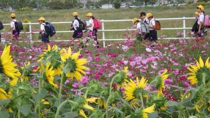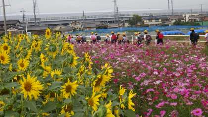 上和会地区に地域の方が育てている秋桜や向日葵の花が美しく咲いています。