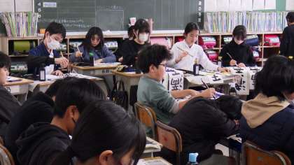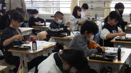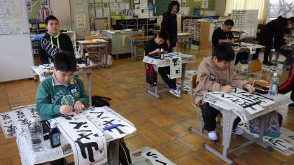 1月7日に書初め大会が行われました。5、6年生、支援学級では、どの子も真剣な表情で取り組んでいました。