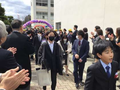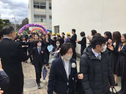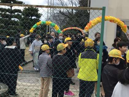 5年生や先生の見送りを受けて、花のアーチをくぐります。