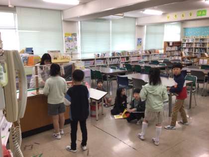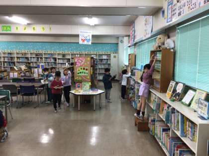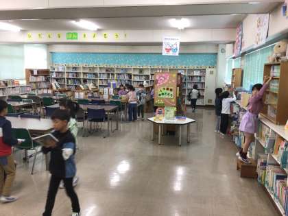 2年生は、図書館で本を借りています。