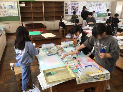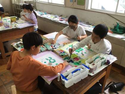 4年生の図工です。絵の具を使って、夢の世界のデザインをしています。