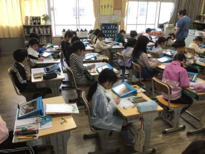 3年生は理科で、タブレットを使って、種まきの様子をスケッチしています。
