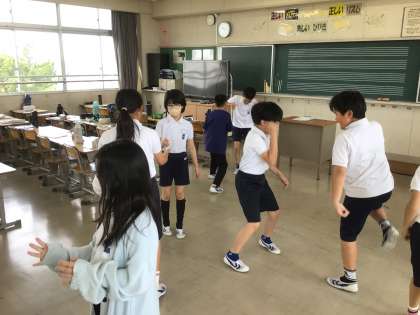 5年生の音楽です。 ウォーミングアップでジャンケン列車をしています。