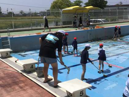6年生プール清掃です。 プールがだんだん、きれいになっています。
