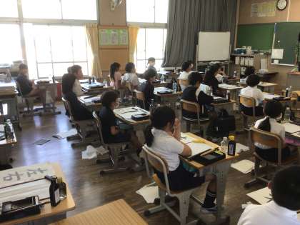 4年生の書写です。話を聞く姿勢がすばらしい。