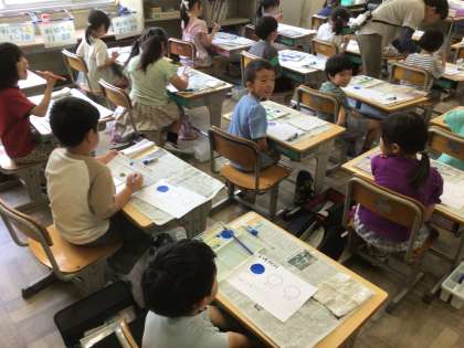 1年生の図工です。絵の具の練習です。