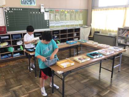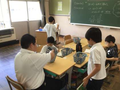 5組の算数です。本物のお菓子を使って、計算します。