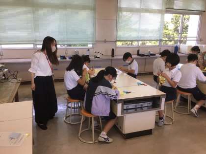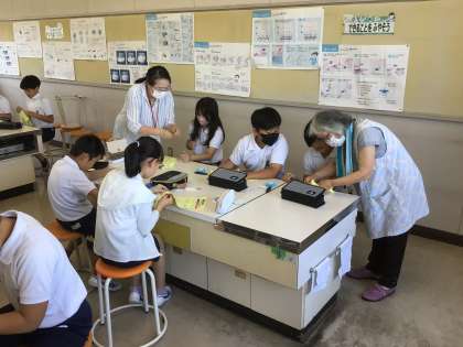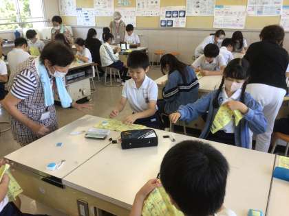 5年生の家庭科です。 ボランティアさんといっしょに裁縫をします。