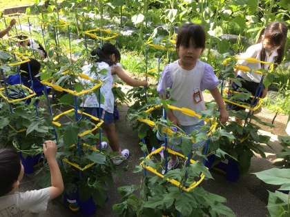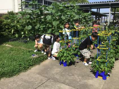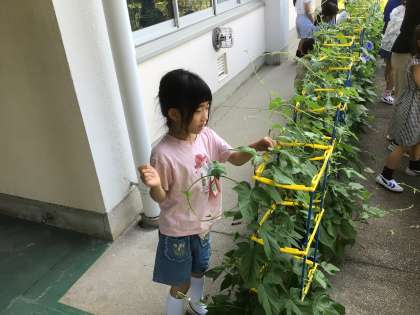 1年生は、アサガオの観察をしています。 いくつ花が咲いたかな?