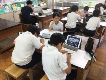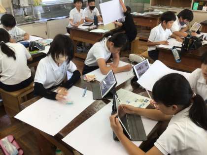 5年生の図工です。思い出の絵をタブレットを使いながら、かいています。