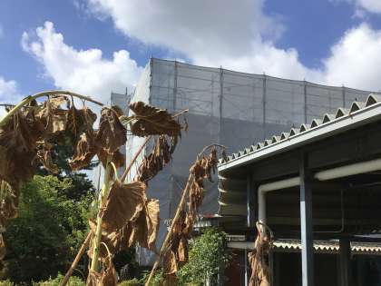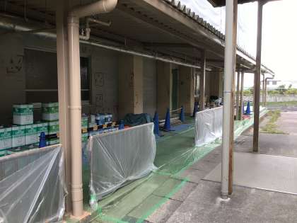 体育館の塗装工事は順調に進んでいます。
