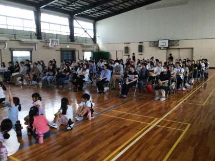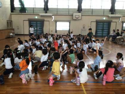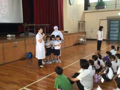 1年生は、体育館で豊田市の栄養教諭さんをお招きし、給食について、勉強しました。