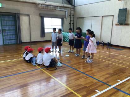 1年生が楽しめるようにと考え、2年生がおもちゃまつりを開催しました。笑顔で説明する2年生、遊びを楽しむ1年生の姿がありました。
