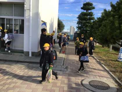 朝のあいさつ運動です。 コミュニティ会議からいただいた旗が役立っています。
