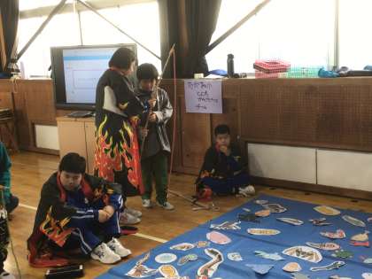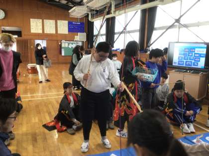 上郷中学校武道場で、特別支援の小中交流会を行いました。