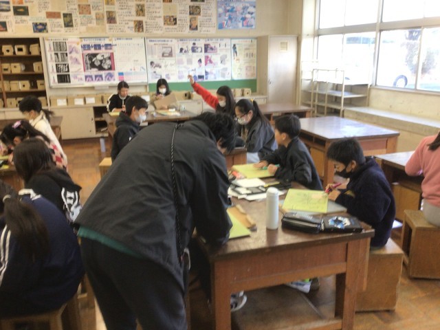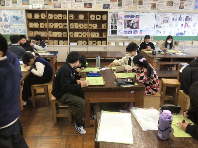 5年生の図工です。版画の下絵を彫刻刀で掘っています。