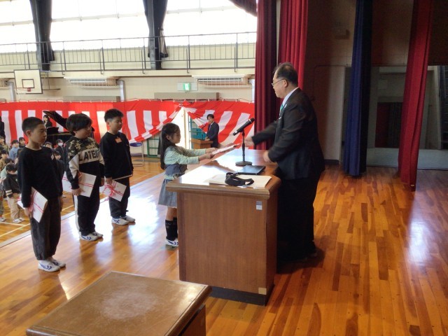 各学年の代表の子に、校長先生から終了証を渡しました。