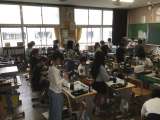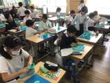 5年生の図工です。電動糸ノコギリを使って、木製パズルを作ります。
