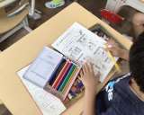1年生がプールから教室に戻って、プールチャレンジカードを記入していました。今日は、何をやったのかを尋ねると「どこまで もぐれるかな」をやったと教えてくれました。口まで、鼻まで、頭までの3段階にチャレンジしたそうです。