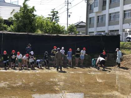 5月10日(月)地域の農協と農事組合法人「若竹」さんの協力のもと、5年生が田植えを体験しました。秋には稲刈りも体験します。社会科の授業として行いました。