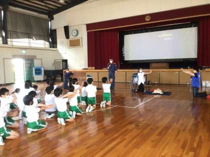 5月30日(月)に5年生が学級ごとに応急手当講習を受けました。心臓マッサージ等の応急手当について学びました。