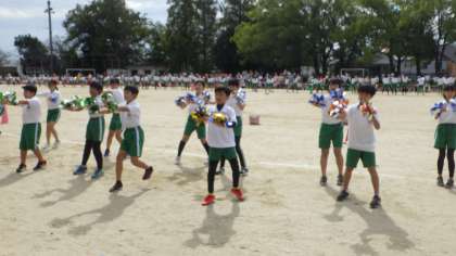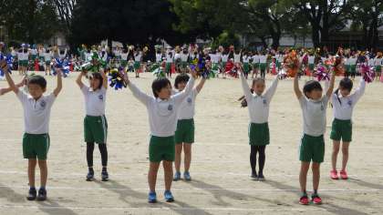 校内運動会、中学年演技種目「竹村サンバ・キャラクター」の様子です。