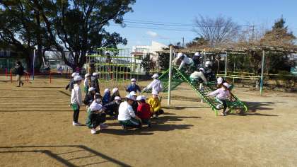 新しい遊具の設置工事・検査が終わり、使用開始となりました。写真は1年生の様子です。
