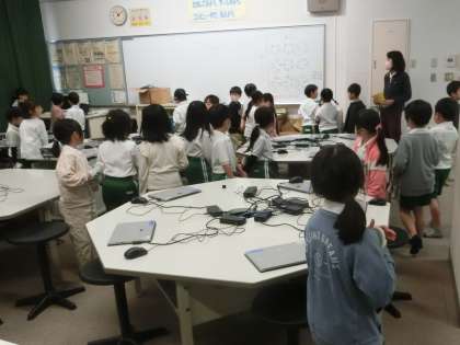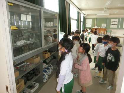 1年生は、学校探検の授業を行っています。理科室やコンピュータ室など、自分たちの教室以外にもどんな教室があるのかを見てまわりました。
