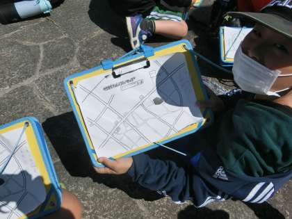 児童たちは、学区を歩いて気づいたことを地図に書き込んでいました。