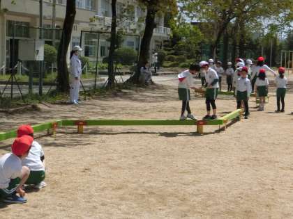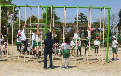 運動場で、新しくなった上り棒や平均台を使って体育の授業が行われていました。腕力やバランス感覚を高める授業でした。