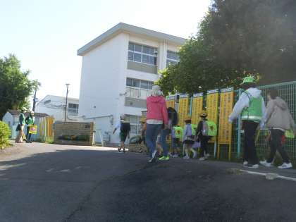 5月になりました。集合場所までの1年生のお迎え係の活動が4月に終了しましたが、今日も通学団での登校がしっかりとできていました。