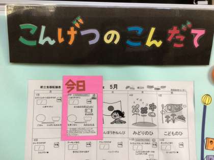 今日の給食は、端午の節句にちなんだ献立です。こどもの成長を願った食べ物を味わいます。(かしわもち、かつお:かつおのそぼろ丼、たけのこ:若竹汁)