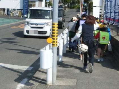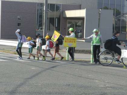 登校時には、通学団の児童が安全に道路を横断できるように、毎朝、セーフティーの方が見まりをしていただいています。保護者の方にも、ローテーションで見守りにご協力いただいています。交通指導員の方は、一番遠い通学団の児童と一緒に歩いてくださっています。