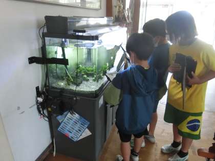 5年生の図工で、来客用玄関にある水槽の前でスケッチの素材探しをしている児童がいました。