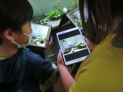 動く魚をタブレットでうまく撮影できたがどうか、見比べていました。何枚も撮影した中から、自分の気に入ったものを水彩画にしていきます。