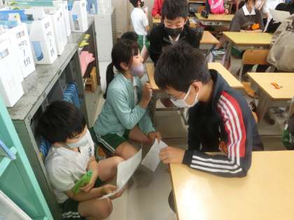 キャンプの持ち物や食事など、自分が知りたいテーマで質問を考え、5年生と6年生が協力して学びを進めていました。