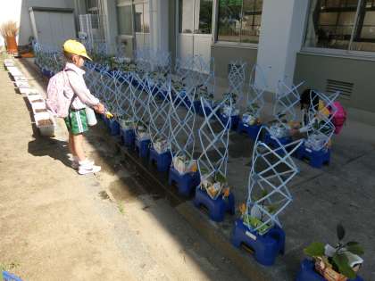 2年生も、登校後に自分たちが育てている野菜に水やりをしています。竹ボラさんも様子を見に来て、アドバイスをしてくださっています。