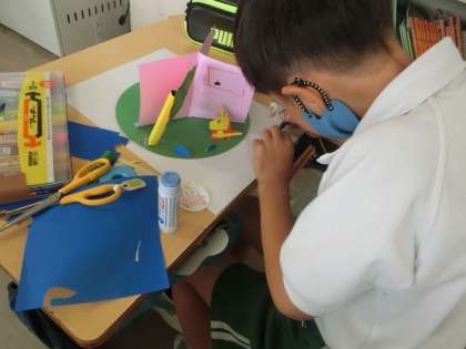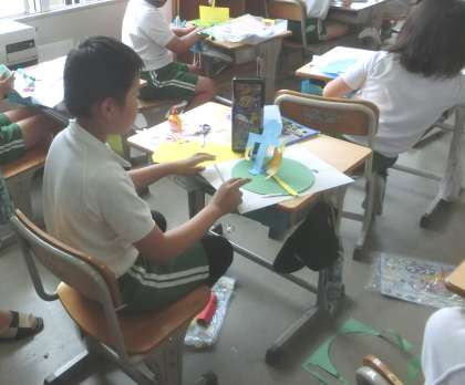 きれいにはさみで切る、きれいいはる、色の組み合わせ、組み立て方などが、作品作りのポイントとして、児童に伝えられています。