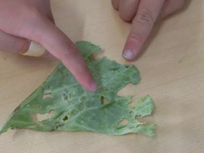 竹ボラさんが畑で育てくださったキャベツに、モンシロチョウが卵を産み付け、今では、卵から幼虫になり、すくすくと育っています。
