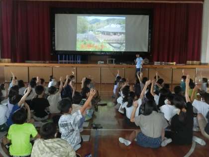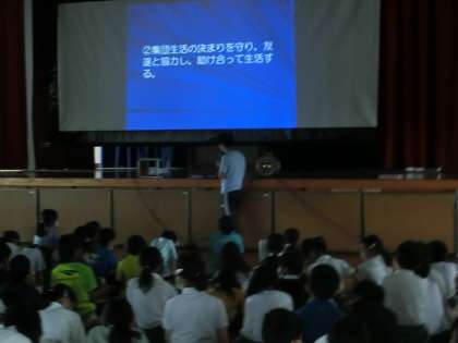 学年集会で、野外学習に何のために行くのか、何をやるのか、どんな持ち物が必要なのかなどを説明しています。