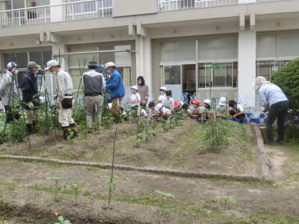 昼放課に野菜の生長を見に来た2年生が、竹ボラさんに「ありがとうございます」と感謝の気持ちを伝えていました。