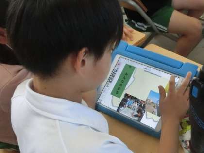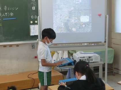 上の写真は、校外学習に行く前の社会の授業で豊田市について調べ学習をしているようすです。