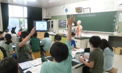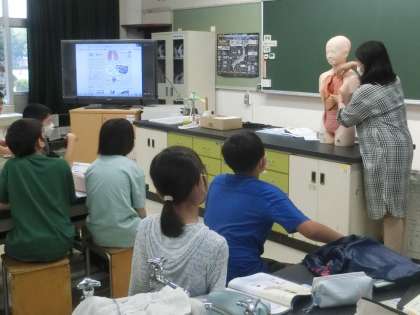 今日は、「肺」について学んでいました。人体模型で体のどこにあり、どのような形をしているのかを確かめ、肺の役割について考えていました。